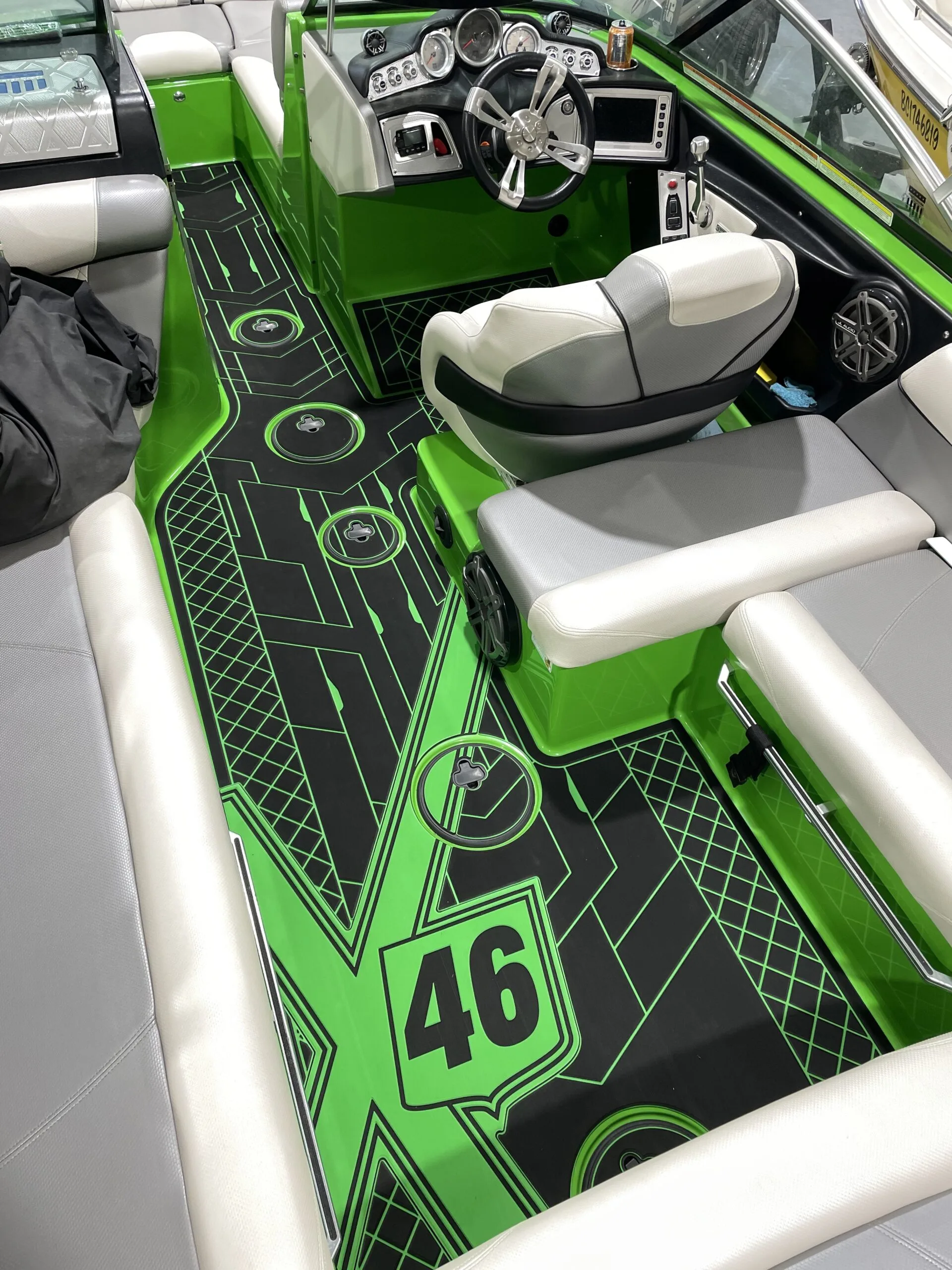 “We have been using UltraDeck for a few years now in our 24’ Kingfisher and it was absolutely worth it! Not only did we get to custom order our design and logos, but there are so many colour options to choose from. Perfect way to add comfort to our aluminum boat that is super easy to clean and very durable. It also keeps the back deck cooler in the summer not having hot aluminum to walk on with bare feet. Highly recommend this product in any boat! Andrew and the team are awesome to work with and passionate boaters and have unique design ideas for every personal style.”